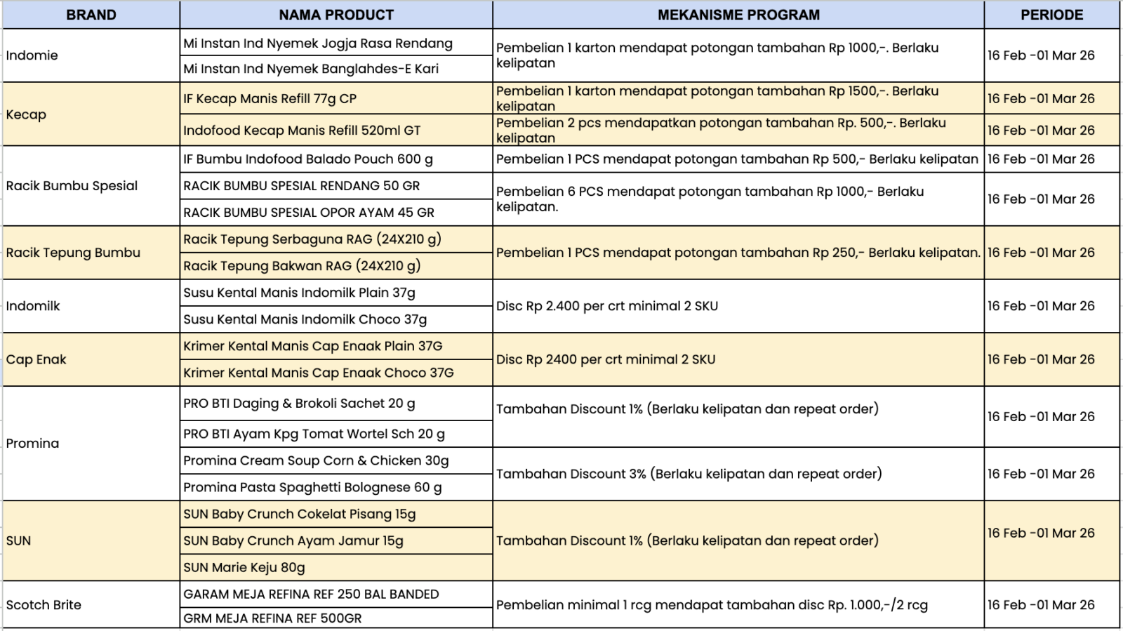 Promo ini dirancang khusus untuk membantu kamu mengisi stok dengan lebih efisien—mulai dari kebutuhan harian, produk favorit pelanggan, hingga produk yang cepat laku di warung. Semua promo hanya bisa kamu nikmati jika melakukan pemesanan melalui aplikasi Indomarco, jadi pastikan akunmu sudah terdaftar dan aktif.